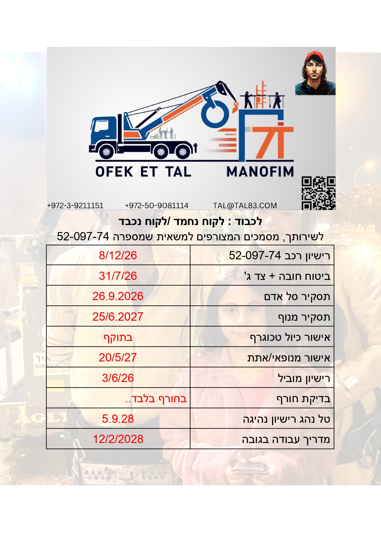 לקוח נחמד / לקוח נכבד. לשירותך ולרשותך, מסמכי המשאית והמנוף, ביטוחים, תסקירים. ועוד. בצורה מסודרת ומעודכנת